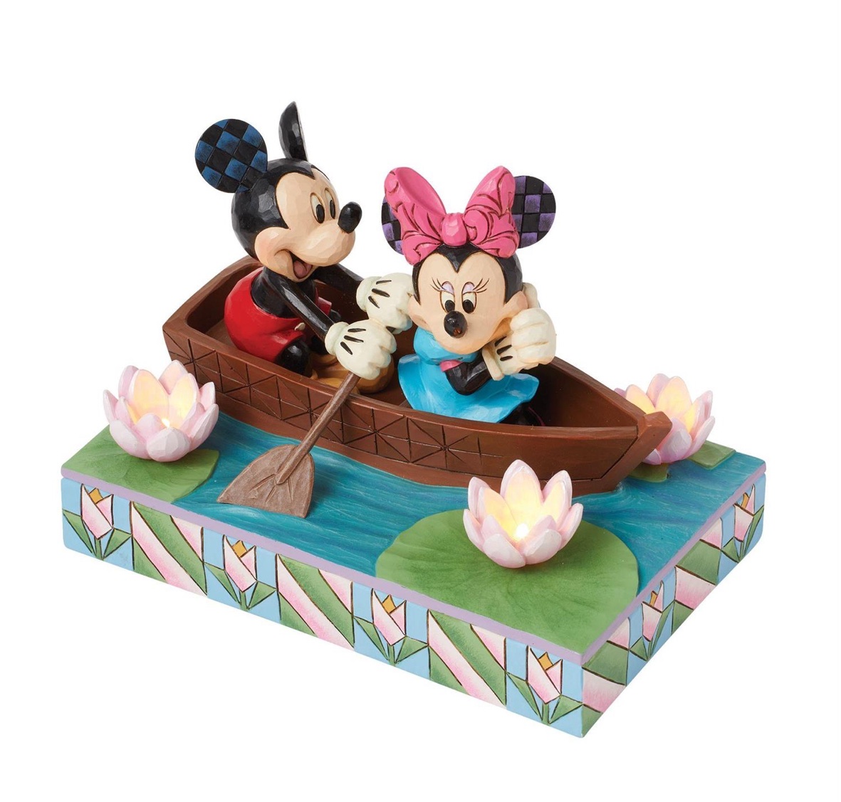 Jim Shore creates a romantic scene of beloved characters, Mickey and Minnie Mouse aboard a quaint rowboat bathed in the glow of tranquility. Amidst the serenity of nature, blooming flowers adorn their river rendezvous as the two love birds float on.